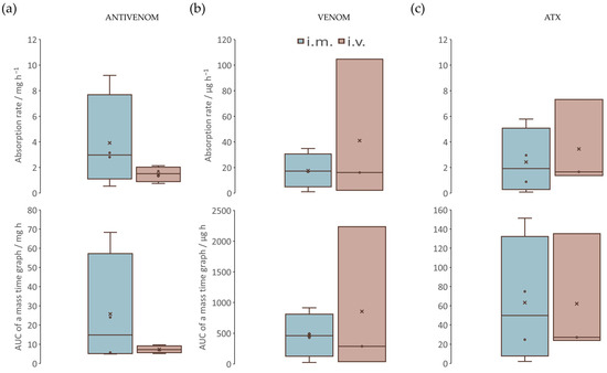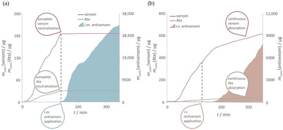 The lymphatic absorption of either the whole venom or ammodytoxins (Atxs) was monitored by measuring their concentrations (Tables S1 and S2). In the Li.m. group, i.m. antivenom, even at low doses (about 500 µg on average), rapidly (after an average of 23 min) succeeded in complete neutralization of the venom present in the lymphatic circulation (Figure 4a). Atxs were completely neutralized somewhat earlier (after an average of 15 min), when i.m. antivenom was absorbed at an average dose of only 13 µg. On the contrary, in the Li.v. group, i.v. antivenom-mediated neutralization of the venom and Atxs was only partial (Figure 4b). The rate of venom absorption (17.6 ± 6.9 µg h−1 vs. 41.0 ± 32.1 µg h−1) and the total amount of venom reaching the lymph during the sampling period (AUC0-t) (465.6.6 ± 256.6 µg ∙ h vs. 853.8 ± 694.6 µg ∙ h) were generally lower when the antivenom was given i.m. vs. i.v., respectively (Figure 3b, Table S3). Due to the high variability in the venom exposure levels within the Li.v. group, the differences could not be proved as significant (p > 0.05) for any of the observed parameters. In contrast to venom, the absorption rate of Atxs and their AUC0-t were congruent in both groups, regardless of the administration route (Figure 3c, Table S3).