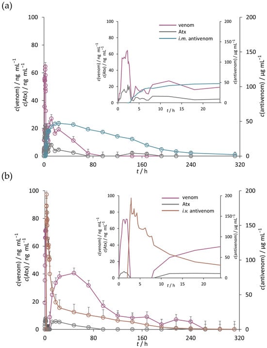 Venom and antivenom pharmacokinetics in the systemic circulation. Representative pharmacokinetic profiles of venom, ammodytoxins (Atxs) and i.m. administered antivenom in the systemic circulation of a sheep from the Si.m. group during the entire sampling period and during the first 24 h (excerpt) (a). Representative pharmacokinetic profiles of venom, Atxs and i.v. administered antivenom in the systemic circulation of a sheep from the Si.v. group during the entires ampling period and during the first 24 h (excerpt) (b). Results are presented as the mean of three independent measurements ± standard error.