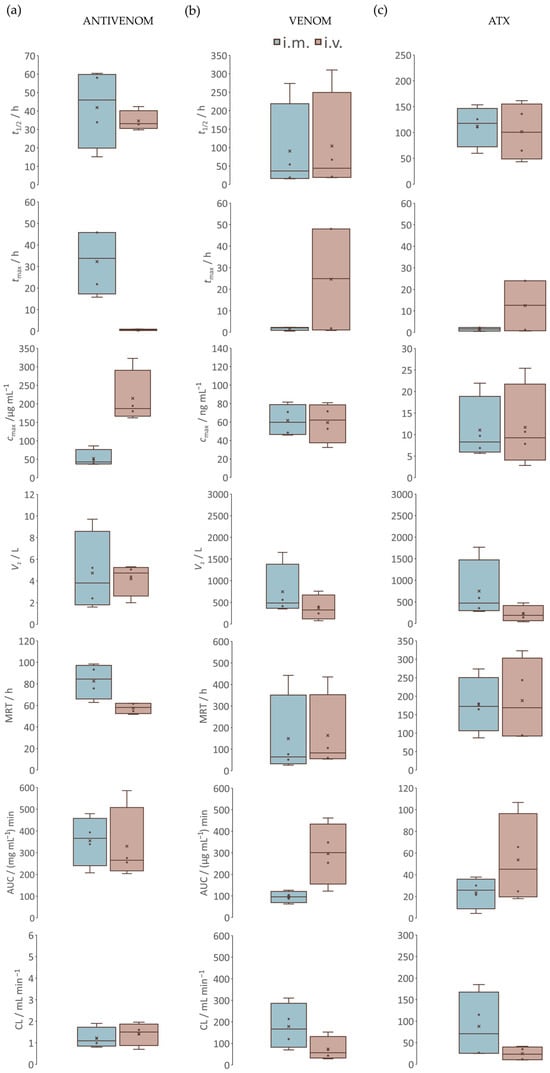 The concentrations of venom and Atxs (Figure 5, Tables S4 and S5) were used for the determination of pharmacokinetic parameters (Figure 6b,c, Table S6). In both groups, the maximum venom concentrations (cmax) measured in serum were congruent but reached at different times (Table S6). In the Si.m. group, the cmax was achieved either during the pre-treatment period or immediately after antivenom administration and just before neutralization of the venom, manifested by an immediate drop in its concentration to baseline (Figure 5a). Complete neutralization occurred 4 days post-antivenom administration, with the exception of one animal in which only two hours were required. In the Si.v. group, the cmax of venom was achieved either during the pre-treatment period or even 2 days after antivenom administration. Namely, the initial neutralization of the venom, which occurred a few minutes post-antivenom administration, was followed by a pronounced secondary rise in its serum concentrations (Figure 5b). The phenomenon was also observed in the Si.m. group but to a lesser extent (Figure 5a). Namely, total venom exposure during the post-treatment period was three times lower when antivenom was administered i.m. in comparison to that given i.v. (93.3 ((µg mL−1) ∙ min) vs. 285.0 ((µg mL−1) ∙ min). In addition, i.m. antivenom provided a higher volume of distribution (Vz) and clearance (CL) of the venom (Figure 6b, Table S6). Congruent results were obtained when the pharmacokinetics of Atxs were followed (Figure 6c, Table S6).