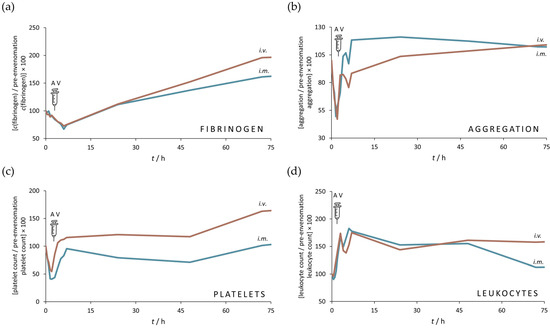 Impact of i.m. and i.v. antivenoms on the venom-induced blood disorders. Fibrinogen concentration (a), degree of aggregation (b), platelet (c) and leukocyte count (d) are determined in blood samples taken before and after envenoming and during the post-treatment period. The results are given as the mean of the values obtained for each animal.