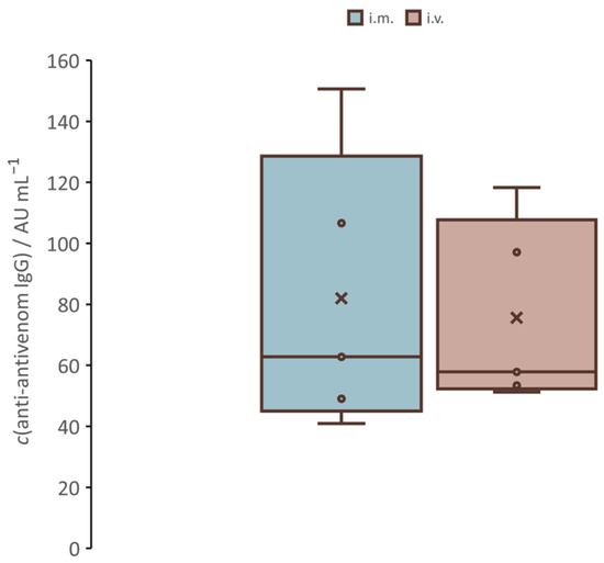 The evaluation of IgGs raised against equine F(ab’)2 fragments in serum samples of the animals from the rescue study, which were collected two weeks after therapeutic intervention, was assesed. There was no significant difference in the humoral response between animals that received antivenom by the i.m. route and those that received it by the i.v. route (U test, p > 0.05) (Figure 8).