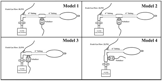 Model 1: FGF 8 LPM with nebulizer distal to FGF; Model 2: FGF 2 LPM with nebulizer distal to FGF; Model 3: FGF 2 LPM with nebulizer proximal to FGF; Model 4: FGF 2L PM with nebulizer between FGF and filter.