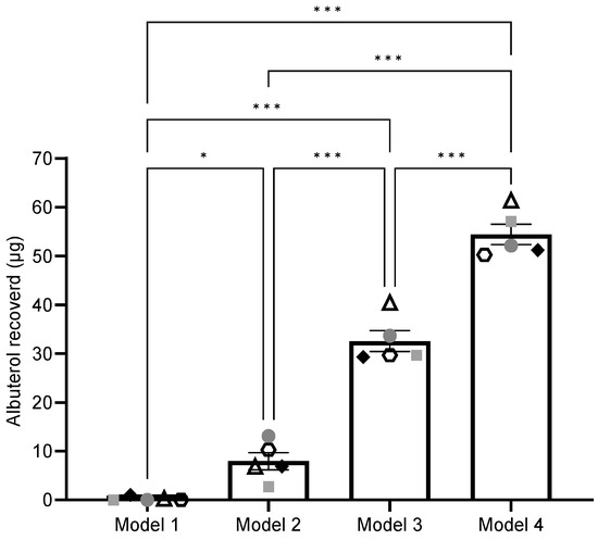 Comparison of albuterol recovered from each delivery model. Each data point represents results from individual participant (n = 5, each user assigned a unique symbol). Data were analyzed by one-way ANOVA with Tukey’s multiple-comparison test using GraphPad Prism version 10.1.1 (San Diego, CA, USA). Normality of residuals passed Shapiro-Wilk test. Data represent mean ± SE, p < 0.05 was considered significant, * p < 0.05, *** p < 0.001.