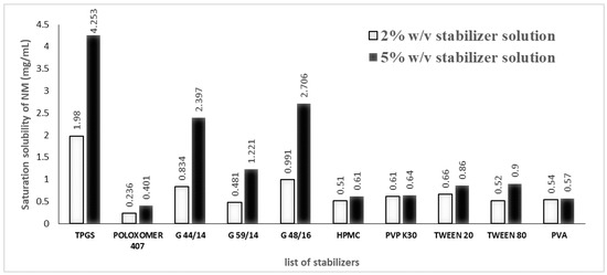 Saturation solubility of NM in aqueous solutions (2% w/v and 5% w/v) of different stabilizers.