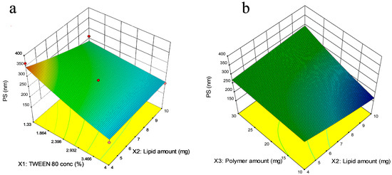 In Figure 3b, the 3D graph showed that at a fixed level of Tween 80 concentration of 2.66%, an increase in lipid amount and polymer amount from 4 mg to 10 mg and 10 mg to 30 mg, respectively, resulted in increased PS. The reason could be the increased viscosity of the organic solution due to higher concentrations of solids in it. The viscosity directly affects the efficiency of size reduction by homogenization as more force is required to break the particles efficiently.