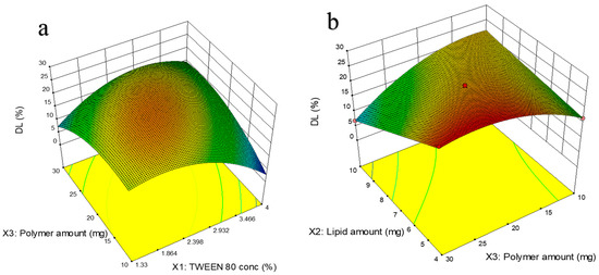 Illustrations of the impact of significant factors on the DL (%) of the optimized NM-LNPs using 3D response surface plots: (a) X1X3 vs. DL (%); (b) X2X3 vs. DL (%).