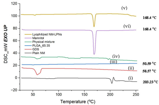 DSC thermograms of (i) plain NM, (ii) GDS, (iii) PLGA_65:35, (iv) physical mixture of plain NM, GDS, and PLGA, (v) lyophilized NM-LPNs, and (vi) mannitol.