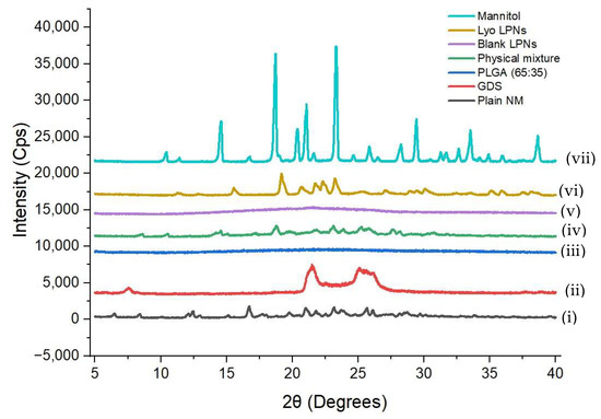 The pXRD graphs of (i) plain NM, (ii) GDS, (iii) PLGA (65:35), (iv) physical mixture of plain NM, GDS, and PLGA, (v) blank LPNs, (vi) lyophilized NM-LPNs (vii) mannitol.