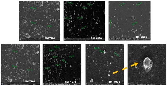 The SEM images of NM-LPNs samples at different time points during stability studies, INITIAL, 1M 2560 (1 month of storage at 25 ± 2 °C and 60 ± 5% RH), 3M 2560 (3 months of storage at 25 ± 2 °C and 60 ± 5% RH), 1M 4075 (1 month of storage at 40 ± 2 °C and 75 ± 5% RH), 3M 4075 (3 months of storage at 40 ± 2 °C and 75 ± 5% RH), and a porous LPN.