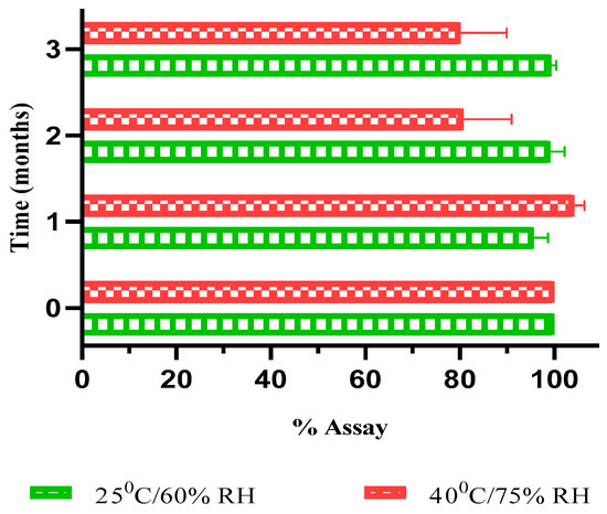The results obtained from drug content (% Assay) analysis of NM-LPNs samples stored at 25 ± 2 °C and 60 ± 5% RH as well as 40 ± 2 °C and 75 ± 5%, during the 3-month stability study are presented in Figure 8. At 25 ± 2 °C and 60 ± 5% RH (CRT), the optimized NM-LPNs showed no difference in the drug content (99.38 ± 1.0%) over the 3-month stability study. At 40 ± 2 °C and 75 ± 5% RH (accelerated condition), the drug content of the optimized NM-LPNs did not change significantly till 1 month of storage. However, the NM-LPNs samples analyzed at the end of the 2nd month and 3rd month showed a 20% drop in the drug content compared to the same sample at time ‘t = 0’ (initial time point). These results correlate with the observations from SEM images of NM-LPN samples analyzed at the 3rd month of storage in accelerated conditions. The decrease in drug content after 1-month storage at accelerated conditions could be due to the porous and leaky nature of the LPNs due to the degradation of the PLGA (65:35) polymer.