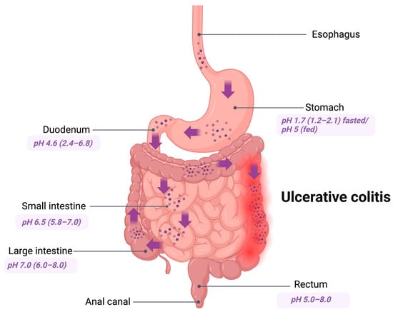 Enteric coatings are widely recognized, and many marketed UC treatments utilize them to delay drug release, aiming to enhance local drug delivery. These coatings have shown benefits for IBD patients. However, the pH profiles in the GITs of individuals with active IBD indicate that precise control over the release site—especially from the terminal ileum onward—is challenging when relying solely on pH-sensitive polymer coatings. Effective UC treatment can be achieved by orally delivering drugs through colon-specific systems, allowing the medication to act both locally and systemically [23].