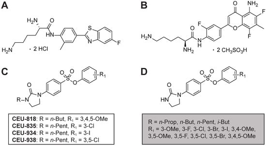Molecular structures of (A) (2S)-2,6-diamino-N-(4-(5-fluorobenzo[d]thiazol-2-yl)-2-methylphenyl)hexanamide dihydrochloride (Phortress), (B) (2S)-2,6-diamino-N-(4-(5-amino-6,8-difluoro-7-methyl-4-oxochroman-2-yl)-2-fluorophenyl)hexanamide dimethanesulfonate (AFP464), (C) phenyl 4-(2-oxo-3-alkylimidazolidin-1-yl)benzenesulfonates (PAIB-SOs), and (D) phenyl 4-(2-oxoimidazolidin-1-yl)benzenesulfonates (PIB-SOs).