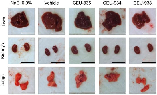 Representative macroscopic pictures of livers, kidneys, and lungs of CD1® IGS female mice necropsied after multi-intravenous administration of NaCl 0.9%, vehicle, CEU-835, -934, and -938. The scale bar is set at 1000 mm. n = 3.