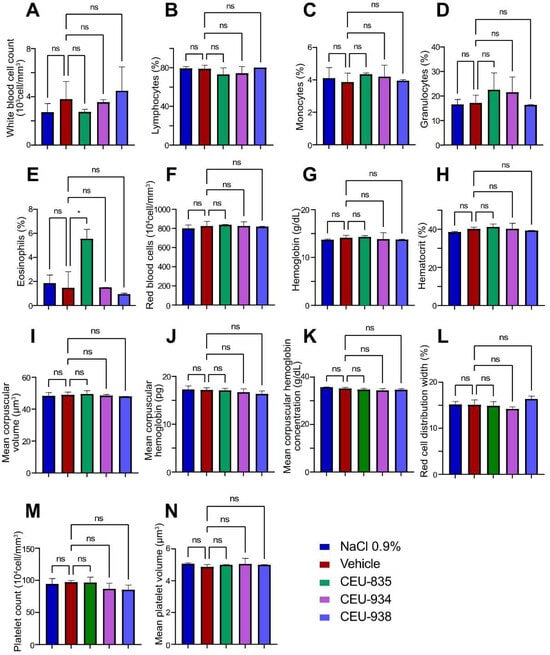 Total blood count profiles after multi-intravenous administration of NaCl 0.9% (n = 3), vehicle (n = 3), CEU-835 (n = 3), -934 (n = 3), and -938 (n = 3) in CD1® IGS female mice of (A) white blood cells, (B) lymphocytes, (C) monocytes, (D) granulocytes, (E) eosinophils, (F) red blood cells, (G) hemoglobin, (H) hematocrit, (I) mean corpuscular volume, (J) mean corpuscular hemoglobin, (K) mean corpuscular hemoglobin concentration, (L) red cell distribution width, (M) platelet count, and (N) mean platelet volume. The p-value for all parameters is p < 0.05. ns: non-statistically significant. *: statistically significant.