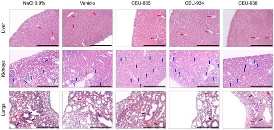 Representative pictures of the eosin-hematoxylin histological analysis at 10× of liver, kidneys, and lungs of CD1® IGS female mice necropsied after multi-intravenous administration of NaCl 0.9%, vehicle, CEU-835, -934, and -938. The scale bar is set at 300 µm. The indicated tissue structures are blood vessels (red arrows), glomeruli (blue arrows), renal tubulointerstitium (green arrows), parenchyma (light blue arrows) and bronchoalveolar structures (black arrows). n = 3.