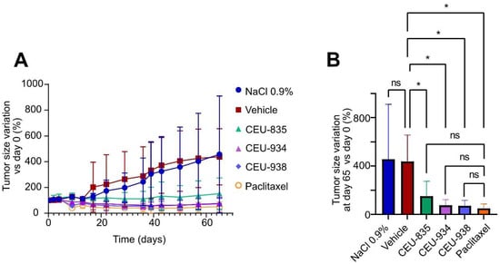 (A) Tumor growth curves expressing the tumor volume variation relative to the tumor volume at day 0. (B) Comparison of tumor volume variations at 65 days after the first intravenous administration compared to day-0 tumor volumes. The p-value for all parameters is p < 0.05. ns: non-statistically significant. *: statistically significant. n = 8–10.