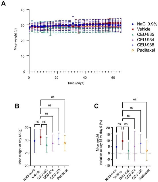(A) Curves expressing the mice weight variation for 65 days after the first intravenous administration. (B) Mouse weights at day 65, and (C) curves expressing the mouse weight variations at day 65 vs. the mouse weights at day 0. The p-value is p < 0.05. ns: non-statistically significant. n = 8–10.