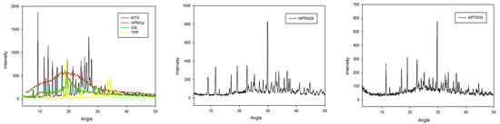The X-ray diffraction spectra of NPPM29 and NPTM33 are shown in Figure 2. The presence of two new peaks of crystallinity at 2θ can be observed, which indicates that the complexation between the polymers could cause a structural rearrangement leading to the formation of new structures with crystalline characteristics [23,32].