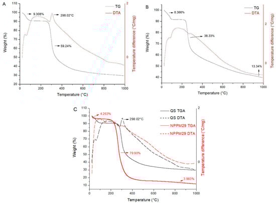 TGA and DTA curves of QS (A), MTX (B), and QS compared to NPPM29 (C) obtained in the 25 °C range at 1100 °C, under a nitrogen atmosphere and heating rates of 20 °C.min−1.