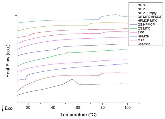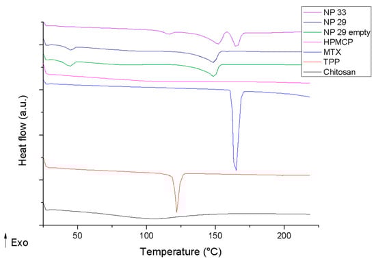 DSC curves of methotrexate (MTX), nanoparticles (NPP29, NPPM29, NPT33, NPTM33), and polymers (chitosan, HPMCP, and TPP).
