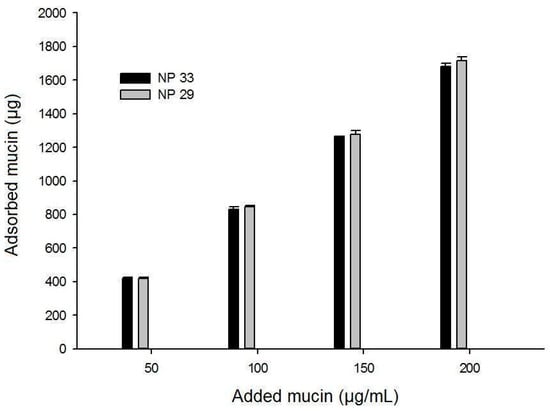 This method was adapted from [23,24]. Lyophilized nanoparticles (20 mg) were added to 10 mL of mucin aqueous solutions at different concentrations (50, 100, 150, and 200 g/mL), vortexed, and incubated in the thermostatic bath at 37 °C for 1 h. Then, they were centrifuged at 8000 rpm (5 min), and the supernatant was used for the quantification of free mucin (749 nm), using a Lowry protein assay modified by Peterson [24,25,26]. Free mucin determination from the supernatants was quantified using the Total Protein Kit, Micro Lowry, and Peterson’s Modification (Sigma-Aldrich®, St Louis, MO, USA) were used. Data from mucin adsorption were fitted using Freundlich (Equation (2)) and Langmuir (Equation (3)) models that describe the adsorption isotherms [25].