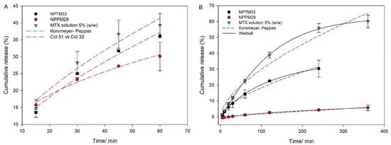 The drug release kinetics were evaluated by different mathematical models, such as zero order, first order, Weibull, Korsmeyer–Peppas, and Higuchi [28]. To select the best model that fits the release profile obtained for the samples, the correlation coefficient (R) was used. The kinetic drug release models can be plotted using Sigma Plot software, which presents a library of most employed mathematical models used for controlled drug release systems.