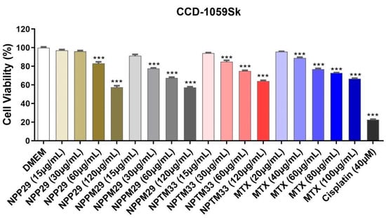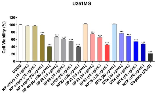 The FTIR spectra of NPTM33 (Supplementary Materials) show a broadening of the band between 1647 and 1377 cm−1, corresponding to the C=O and C-N of chitosan [38], in addition to the displacement of the 1122 cm−1 band related to (P-O) group of TPP. These modifications can be attributed to the interaction between chitosan and TPP.