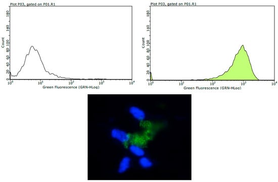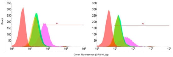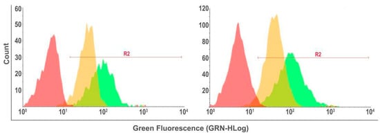 The resulting solution was placed in a dialysis membrane and immersed in water at room temperature, with agitation at 200 rpm for 15 min to continue removing unreacted FITC. The water in the beaker was changed four times, and the absence of fluorescence in the wash water was verified using a fluorometer. If necessary, the volume of the QS-FITC solution was adjusted to 1 mL, the pH was adjusted to 5.5, and NPP29 (empty) was prepared (adapted from [29]). The internalization profile in NPP29 was analyzed by flow cytometry and fluorescence microscopy. Cultures were exposed to NPP29 for 24 h (25 µL of stock solution in 1 mL of culture medium), and the samples were subsequently analyzed.