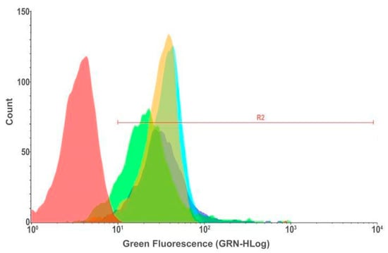 Loaded nanoparticles were evaluated using 25 µL of MTX/FITC, and NPPM29 samples were used in 1000 µL of culture medium, with cultures exposed for 2 and 6 h. The 2 h time was considered more promising and was therefore used in subsequent experiments investigating the effect of MTX/FITC, NPPM29, and verapamil on the efflux pump. From the results shown in Figure 11, the cell percentage that incorporated the NPs after 2 h of exposure was 96.9%. This percentage was higher than that found for the cells treated with free MTX/FITC, which was 91.7%. Thus, it was observed that the NP internalization profile was efficient in U251MG cells.