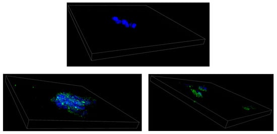 Three-dimensional Images Generated by Confocal Microscopy of NPPM29 Inside Tumor Cells After 12 h (bottom-left) and 24 h (bottom-right) of Treatment. Cells without treatment as control (top). The green fluorescence corresponds to the FITC in the NPs.