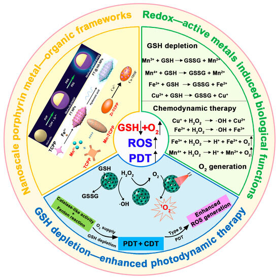 In 2021, Yang et al. systematically and comprehensively discussed the progress of engineered nanomedicines in enhancing cancer therapies through GSH depletion [31]. Wu et al. summarized the synergistic therapeutic effects of GSH-scavenging nanomedicines in conjunction with PDT, CDT, radiotherapy, and chemotherapy [32]. Niu et al. further elucidated how the GSH depletion mechanism enhances treatments based on ROS, promotes ferroptosis, and improves chemotherapy efficacy [33]. Subsequently, Wang et al. specifically highlighted the enhancement effects of GSH scavenging on SDT [40]. This review concentrates on an in-depth summary of recent research over the past few years concerning the enhancement of PDT efficacy using porphyrin-based nMOF materials through GSH-scavenging capabilities. It details the molecular mechanisms of various systems designed to reduce GSH, and compares the impact of GSH presence on the 1O2 yield from porphyrin-based nMOFs under light exposure. This review systematically outlines the methodologies for integrating redox-active metals within porphyrin-based nMOFs, assessing both the strengths and challenges associated with each approach (Figure 1). It also elucidates the advantages of employing redox-active metals as formulations for GSH depletion. These metals offer several key benefits: (1) they can directly and effectively deplete GSH via high-valence states [34]; (2) they can also mimic catalase activity to catalyze the decomposition of the higher concentrations of H2O2 found in cancer cells into O2, which not only mitigates hypoxia in cancerous tissues but also facilitates the generation of 1O2 [35]; (3) upon reduction, they can react with the high concentrations of H2O2 within cancer cells to yield hydroxyl radicals—potent oxidants that markedly augment the therapeutic potential of ROS-based treatments (Figure 1) [36]. Finally, this review evaluates the therapeutic effects and application prospects of these systems on malignant tumors and infected wounds at both cellular and animal levels. The review aims to provide valuable insights for the clinical research of porphyrin-based nMOFs.