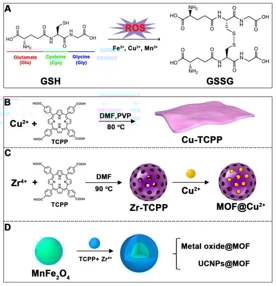 (A) The molecular structure of GSH and its reaction with ROS or metal ions to form GSSG. (B) Schematic illustration of Cu2+ coordination with TCPP to form the Cu-TCPP MOF. (C) Illustration of Zr4+ coordination with TCPP molecules to form the Zr-TCPP MOF, and its subsequent loading with Cu2+ ions. (D) Schematic representation of Zr-TCPP MOF growth on the surface of inorganic oxides or UCNPs.