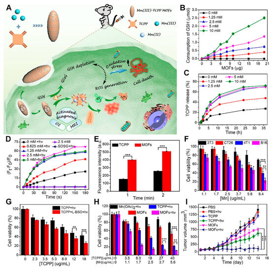 (A) Schematic illustration of the preparation of Mn(III)-TCPP nMOFs and their in vivo GSH-responsive depletion, followed by activation of fluorescence imaging and MRI-guided enhanced PDT therapy. (B) The effect of varying amounts of MOF material on the consumption of GSH at different concentrations. (C) The effect of different GSH concentrations on the release of TCPP molecules from MOFs. (D) ROS-generation ability detected by SOSG. (E) TCPP and MOF-induced ROS-generation ability (10 mM GSH). *** p < 0.001. (F) The cell viability of Mn-TCPP MOFs against four cell lines. (G) Cell viability under different incubation conditions (TCPP + hv, TCPP + L-BSO + hv). ** p < 0.01, *** p < 0.001. (H) Cell viability after treatment with four incubation conditions. ** p < 0.01, *** p < 0.001. (I) Tumor volume changes from different groups after 14 days. *** p < 0.001. Reproduced with permission from [34]. Copyright (2019), American Chemical Society.