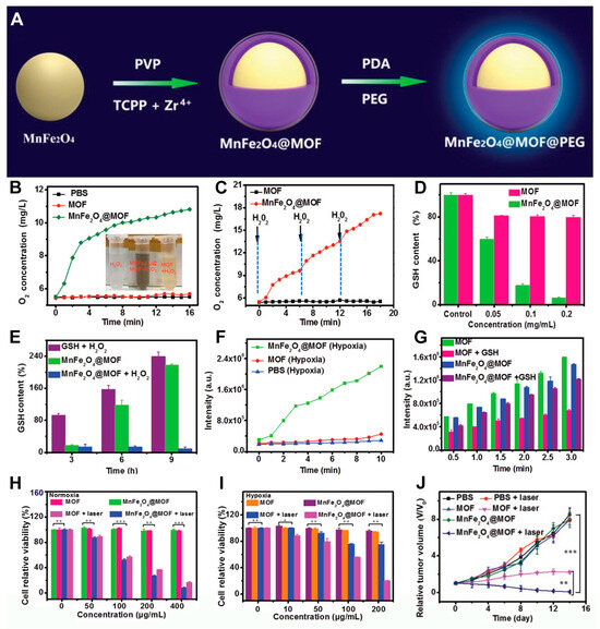 (A) Synthesis procedure of MnFe2O4@MOF@PEG composite material. (B) Comparison of O2 generation by MOF and MnFe2O4@MOF materials after H2O2 addition. (C) Comparison of O2 generation by MOF and MnFe2O4@MOF materials after three additions of H2O2. (D) Comparison of GSH consumption by different concentrations of MOF and MnFe2O4@MOF materials. (E) Variations in GSH levels under three different conditions. (F) Comparison of 1O2 generation by MOF and MnFe2O4@MOF materials under hypoxic conditions. (G) Comparison of 1O2-generation capacity after treatment under four different conditions (using SOSG as a 1O2 scavenger). (H) Comparison of cell viability following treatment under four distinct conditions in normoxic conditions. (** p < 0.01 and *** p < 0.001). (I) Comparison of cell viability following treatment under four distinct conditions in hypoxia conditions (* p < 0.05, ** p < 0.01). (J) Changes in relative tumor volume in mice under six different conditions (** p < 0.01 and *** p < 0.001). Reproduced with permission from [35]. Copyright (2019), John Wiley & Sons, Ltd.