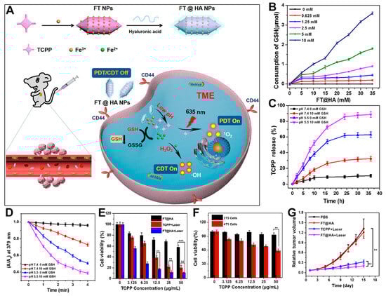 (A) Schematic illustration of the preparation of FT@HA NPs and their in vivo synergistic antitumor mechanism. (B) The effect of different concentrations of FT@HA NPs on the consumption of GSH at varying concentrations. (C) TCPP release from FT@HA NPs triggered by pH and GSH. (D) 1O2-generation capability of FT@HA NPs under different pH and GSH concentration conditions (with ABDA as a 1O2 scavenger). (E) Comparison of the viability of 4T1 cells following treatment under three distinct conditions. (F) Assessment of cell viability in 4T1 and NIH-3T3 cells after exposure to FT@HA NPs. ** p < 0.01, *** p < 0.001. (G) Tumor volume changes after different treatments. Reproduced with permission from [36]. Copyright (2020), American Chemical Society.