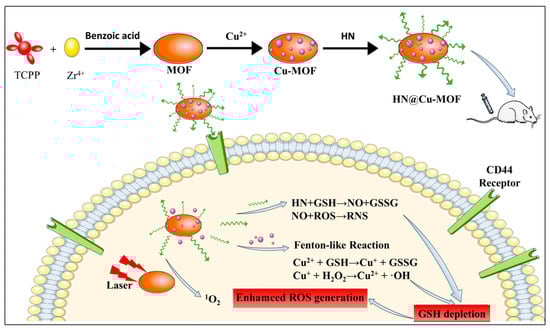 In recent years, green gas therapy has emerged as a widely researched novel therapeutic approach [94,95,96,97]. This treatment modality primarily includes gases such as carbon monoxide (CO), nitric oxide (NO), sulfur dioxide (SO2), and hydrogen sulfide (H2S) [98,99,100]. Among these, NO, acting as a free radical, exhibits dual functionalities: at low concentrations, it can prevent cell apoptosis and promote cancer cell metastasis; however, at higher concentrations, NO induces cell apoptosis through cytotoxic reactions or cellular organelle dysfunction, thereby demonstrating antitumor activity [10]. Moreover, the NO gas could stimulate vasodilation which aids in restoring O2 concentration and enhancing the efficacy of PDT [37]. The integration of NO therapy with PDT has become a focal point of extensive research [100]. Additionally, studies have shown that under weakly acidic conditions, the reaction rate between Cu2+/Cu+ significantly increases compared with the transformation rate between Fe3+/Fe2+ [37]. Therefore, Cu-based Fenton reactions offer certain advantages over Fe-based systems. For example, Yuan et al. utilized Zr4+ ions coordinated with TCPP to prepare MOF materials [37]. Following this, they employed a straightforward ion-doping strategy to obtain Cu-MOF materials. They then conjugated NO donor-modified HA with the MOFs via electrostatic interactions, resulting in HN@Cu-MOF composite materials (Figure 6). HA facilitates the accumulation of nanomaterials in specific cancer cells rich in CD44 surface glycoproteins. Once inside the cells, the composite materials interact with intracellular GSH, not only depleting GSH levels but also releasing NO gas. Nitric oxide can react with ROS generated by light-activated materials to produce reactive nitrogen species (RNS). Through doping technology, the Cu2+ ions within the composite material can interact with intracellular GSH to produce Cu+ ions. Subsequently, the generated Cu+ can react with intracellular H2O2, utilizing the Fenton-like reaction mechanism to produce highly oxidative hydroxyl radicals (Figure 6). This system effectively combines GSH depletion-enhanced NO gas therapy, PDT, and CDT for a potent inhibition of cancer cells. The simplicity and effectiveness of this system provide valuable insights into the application of porphyrin-based MOF materials. This work highlights the development of a multifunctional therapeutic platform that integrates NO release, ROS generation, and Cu+-mediated Fenton reactions. By leveraging the unique properties of Cu-based Fenton reactions and NO’s dual role in promoting and inhibiting cancer progression, this study offers a promising strategy for enhancing the therapeutic efficacy of cancer treatments. It also provides a reference for future biomedical applications of porphyrin-based MOFs, emphasizing the importance of combining multiple therapeutic modalities to target the complex nature of cancer cells. In this system, the author investigated the enhancement of PDT effects of porphyrin-based nMOFs through the reaction of GSH-induced Cu+ ions from Cu2+ with H2O2 in cancer cells to generate hydroxyl radicals. However, attention must be paid to the fact that Cu+ ions are extremely susceptible to oxidation by O2 into Cu2+, thereby inhibiting the Fenton-like reaction between Cu+ and H2O2 under slightly acidic conditions [93].