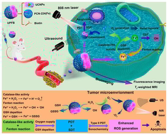 PDT relies on the synergistic effects of photosensitizers, light sources, and oxygen [53,101]. While porphyrin-based MOFs significantly enhance the aqueous dispersion stability and tumor accumulation of hydrophobic photosensitizer molecules, their excitation wavelengths typically fall between 640 and 660 nm, limiting their effectiveness to superficial lesions and hindering penetration into deeper tissues. Consequently, for deep-seated tumors, the therapeutic efficacy of PDT may be suboptimal. Therefore, integrating two-photon or upconversion technologies with porphyrin-based photodynamic materials holds significant promise [38]. Additionally, studies have shown that not only laser irradiation but also ultrasound can activate photosensitive materials to effectively generate ROS [102,103,104,105,106,107]. Based on this premise, Wang et al. employed a ligand exchange method to obtain PVP-coated UCNPs, followed by a one-pot synthesis at 90 °C for 5 h to develop a core–shell structured composite material combining UCNPs with porphyrin-based MOFs, termed UPF (Figure 7) [38]. They further modified the surface of this composite using biotin via amide bond chemistry, resulting in multifunctional UPFB composites. Biotin enhanced the targeting capability of the material towards HeLa cells and U14 tumor cells. After cellular internalization, an 808 nm upconversion mechanism was used to convert low-energy light into higher-energy UV–visible light, which then activated the porphyrin photosensitizer to produce ROS. However, the authors noted that the energy transfer efficiency between the upconversion material and the porphyrin-based MOF in the UPF structure was relatively low. To address this issue, they incorporated SDT activation, utilizing ultrasound as an additional means to excite the photosensitive material. Furthermore, within the cell, Fe3+ ions from Fe-MOF could undergo redox reactions with hydrogen peroxide, generating Fe2+ ions and oxygen. The production of oxygen enhances ROS concentration during the PDT process (Figure 7). Moreover, Fe3+ can react with the abundant reductive substance GSH within cancer cells, depleting GSH levels while generating Fe2+ (Figure 7). This depletion facilitates the sustained presence and generation of high-concentration ROS, leading to cytotoxicity. In the weakly acidic intracellular environment, the generated Fe2+ can further react with H2O2 to form Fe3+ and highly oxidative hydroxyl radicals, which are more potent than 1O2. Thus, this system leverages 808 nm near-infrared light and ultrasound as coactivating energy sources, utilizing the catalase-like activity of Fe elements to increase O2 concentration, intensify GSH depletion, and induce highly oxidative hydroxyl radicals through CDT. It achieves a combined therapeutic approach of PDT, CDT, and SDT, successfully inhibiting the proliferation of U14 tumor cells (Figure 7). This system provides new insights into enhancing PDT efficacy of porphyrin-based MOFs through GSH depletion, paving the way for advanced cancer treatments.