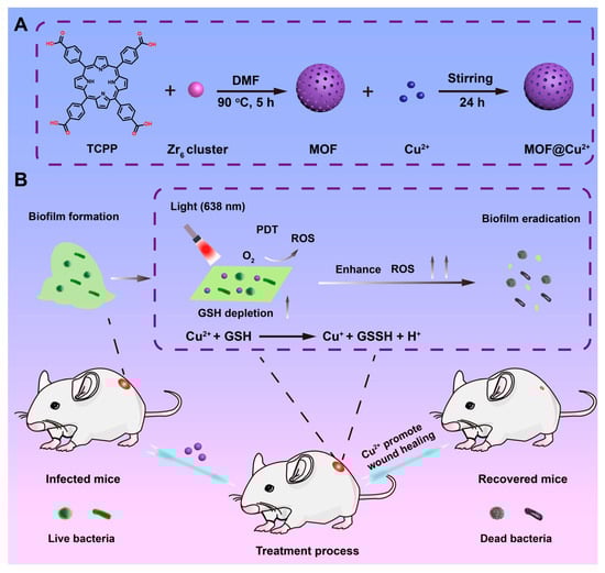 (A) Schematic illustration of the synthesis procedure for MOF@Cu2+. (B) Schematic illustration of how released Cu2+ enhances PDT antibacterial activity of MOF materials under 638 nm light by depleting GSH in bacterial biofilms. Reproduced with permission from [39]. Copyright (2024), The Royal Society of Chemistry.