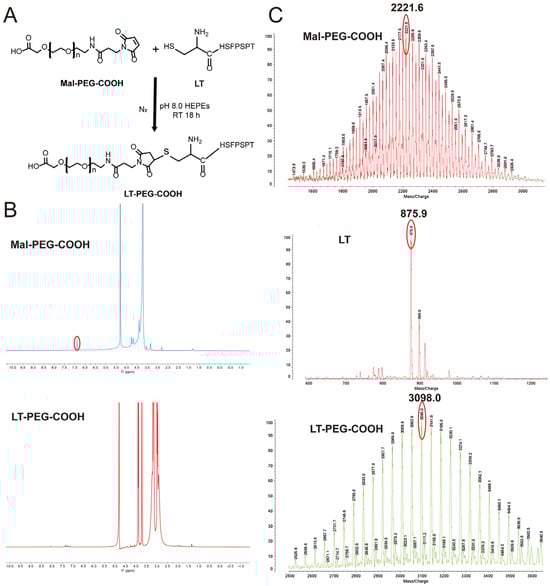 Synthesis of LT-PEG-COOH. (A) Synthesis route of LT-PEG-COOH. (B) 1H NMR spectra of Mal-PEG-COOH and LT-PEG-COOH (D2O: 4.79 ppm). (C) MALDI-TOF-MS spectra of Mal-PEG-COOH, LT, and LT-PEG-COOH.