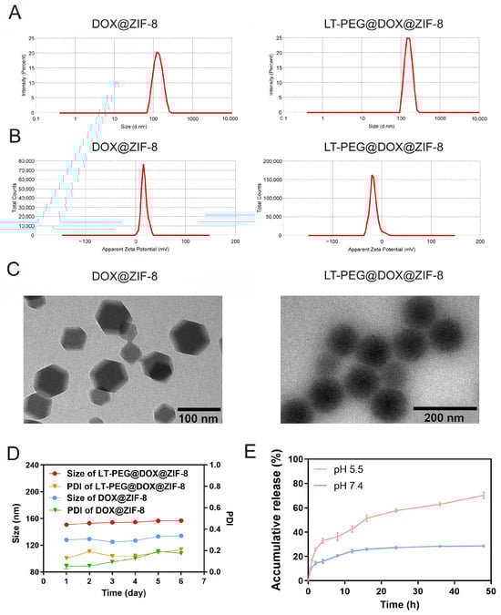 Characterizations of LT-PEG@DOX@ZIF-8. Particle size (A), zeta potential (B), and TEM images (C) of DOX@ZIF-8 and LT-PEG@DOX@ZIF-8. (D) The storage stability of nanoparticles with and without the LT peptide for 6 days in PBS of pH 7.4 at 4 °C. (E) The pH-responsive release profiles of LT-PEG@DOX@ZIF NPs in PBS of pH 7.4 and 5.5 (means ± SDs, n = 3).
