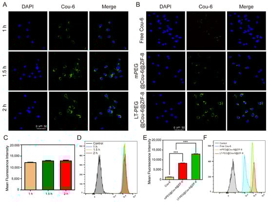 Taking into account the above results, 1.5 h of incubation was set to investigate the cellular uptake by the C26 cells of different preparations. In order to eliminate the interference of PEG, three groups were set up as follows: free Cou-6, mPEG@Cou-6@ZIF-8, and LT-PEG@Cou-6@ZIF-8. According to Figure 3B, the green fluorescent signal was hardly seen in the free Cou-6 group, which means that almost no Cou-6 was taken up by the cells. Similarly, there was only an insignificant amount of the green fluorescent signal in the mPEG@Cou-6@ZIF-8 group, indicating that only low levels of Cou-6 were taken up. On the contrary, extensive green fluorescence signals could be clearly observed in the LT-PEG@Cou-6@ZIF-8 group, suggesting that the cellular uptake efficiency was significantly increased after the modification of LT. Moreover, the quantitative results of the flow cytometry assay were more intuitive. LT-PEG@Cou-6@ZIF-8 displayed the highest cellular uptake efficiency, which was about 9.7-fold higher than free Cou-6 and 1.5-fold higher than mPEG@Cou-6@ZIF-8 (Figure 3E,F). All results indicated that the modification of LT improved the uptake of nanoparticles by the C26 cells.