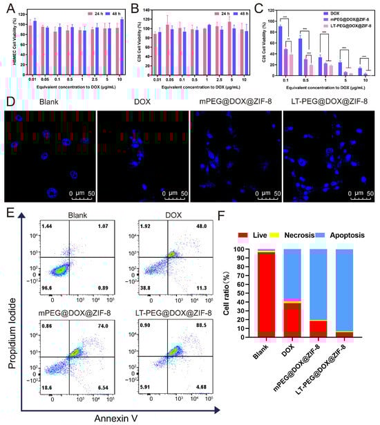 Hoechst 33258 is a blue fluorescent dye that can bind to nuclear DNA. When the nuclei of C26 cells with normal morphology and structure were stained with Hoechst 33258, it could be observed that the nuclei were homogeneous blue with an oval shape under CLSM. On the other hand, when the nuclei of the apoptotic C26 cells were stained with Hoechst 33258, it was observed that the nuclear pores were enlarged and the chromatin was condensed, appearing as bright blue with dense fragments. In Figure 4D, it can be observed that the normal cells were regularly round or oval in the blank group, but after treating with DOX, the cells underwent typical apoptosis-like changes, and the nuclei of the cells became dense, thick-stained, or fragmented, with dense blue fluorescence, which indicated that DOX induced apoptosis in the C26 cells. Furthermore, LT-PEG@DOX@ZIF-8 induced the most cell apoptosis compared to the other treatments, as evidenced by the image. Subsequently, similar results were obtained for further quantitative analysis of apoptosis. According to the methods reported in the extensive references [,,,,], we adopted Annexin-V/PI double staining to quantitatively examine the induction of apoptosis in the C26 cells by different preparations encapsulated with DOX. The apoptosis rates of the free DOX, mPEG@DOX@ZIF-8, and LT-PEG@DOX@ZIF-8 groups were 59.3%, 80.54%, and 93.18%, respectively (Figure 4E,F). The results of Annexin-V/PI double staining and Hoechst staining corroborated each other, together indicating that LT-PEG@DOX@ZIF-8 NPs have a strong apoptosis-inducing potential. The results of apoptosis showed a similar trend in the inhibition of cell proliferation and were in agreement with the results of CLSM, which further indicated that LT-PEG@DOX@ZIF-8 nanoparticles were more readily taken up by the C26 cells, suggesting that LT-PEG@DOX@ZIF-8 has a strong inhibitory effect on cell proliferation and an enhanced apoptosis-inducing effect on C26 cells.