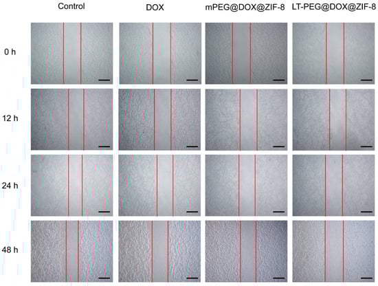 Wound-healing assays were conducted to investigate the effect of different preparations on the migration and invasion of tumor cells. In Figure 5, it can be observed that the scratch area in the control group gradually shrunk, which was driven by the proliferation and movement of the C26 cells over time. Conversely, the scratched areas of the other groups were still clearly visible, suggesting that DOX efficiently inhibited the migration of C26 cells. Furthermore, LT-PEG@DOX@ZIF-8 displayed a stronger resistance to migration than the other groups, probably due to the enhanced cytotoxicity. All of the above results indicated that LT-PEG@DOX@ZIF-8 possessed excellent anti-tumor migration and invasion ability.