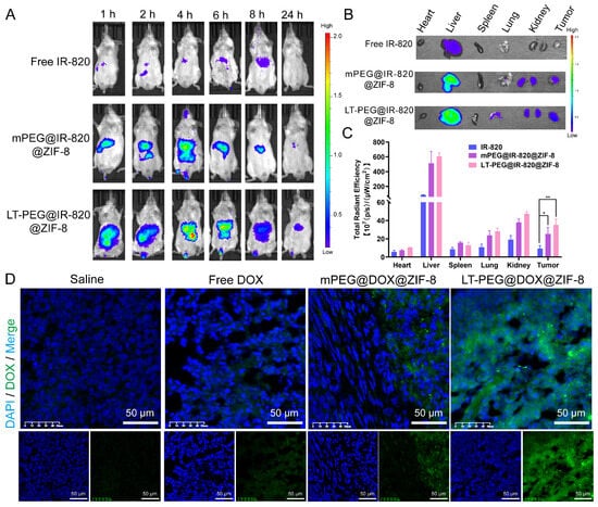 In vivo biodistribution. (A) In vivo imaging of mice treated with different preparations encapsulated IR-820 at 1, 2, 4, 6, 8, and 24 h. (B) Ex vivo images and (C) quantitative analysis of the fluorescence intensities of main organs at 24 h after injection. (D) The distribution of DOX in a tumor at 4 h after systemic administration of various preparations. Blue, cell nuclei stained with DAPI; green, DOX. Means ± SDs, * p < 0.05, ** p < 0.01.