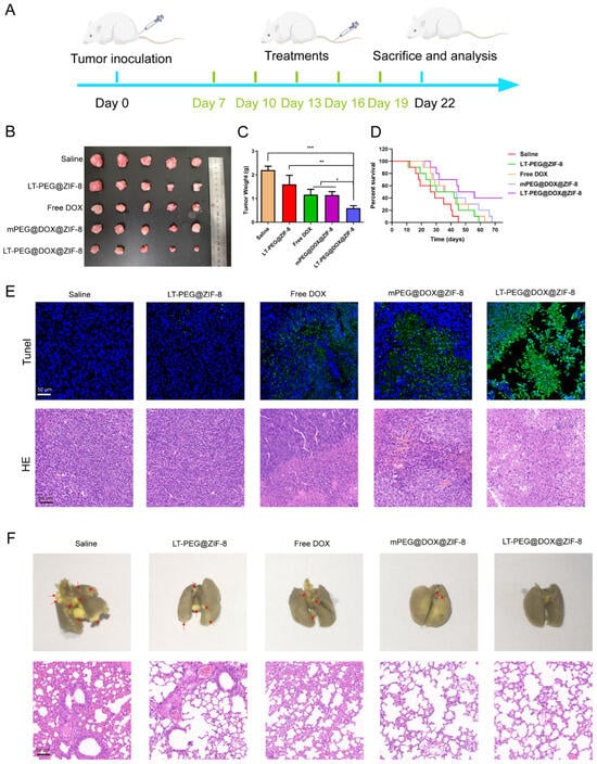 Anti-tumor and antimetastatic efficacy of LT-PEG@DOX@ZIF-8 in vivo. (A) Schematic description of treatment against CRC in vivo. (B) Photographs of collected colorectal tumors. (C) The mean weight of collected colorectal tumors. (D) The survival curves of mice given various preparations. (E) TUNEL and HE staining sections of tumors from mice treated with various preparations. (F) Photographs and HE staining of lungs from mice treated with various preparations. Lung metastases are marked by red arrows. Means ± SDs. * p < 0.05, ** p < 0.01, *** p < 0.001.