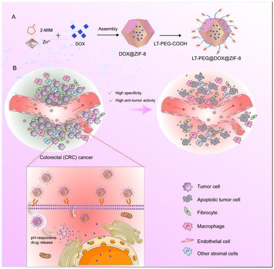 Schematic diagram of the preparation and therapeutic mechanism of LT-PEG@DOX@ZIF-8. (A) The preparation of LT-PEG@DOX@ZIF-8. (B) Schematic illustration of LT-PEG@DOX@ZIF-8 NPs specifically accumulating and exerting anti-tumor efficacy in tumor tissues.