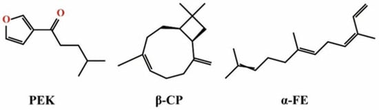 Chemical structures of the three compounds in PO. (PO: perilla essential oil; PEK: perilla ketone; β-CP: β-caryophyllene; α-FE: (Z,E)-α-farnesene).