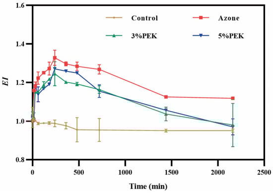To assess the potential of the penetration enhancers to irritate the skin, a non-invasive in vivo skin erythema measurement was performed. The profile of the EI values following the topical administration of the penetration enhancers is shown in Figure 4. The results indicated that the EI values in the azone group were significantly higher than those in the other groups (p < 0.05) and remained elevated, not returning to baseline levels until 36 h after treatment. Due to its potent skin irritation, azone is often used as a positive control in studies evaluating the skin irritation potential of plant essential oils and their components as penetration enhancers []. Furthermore, azone can cause severe skin allergic reactions and edema that are irreversible []. In contrast, the maximum skin irritation response induced by PEK occurred at 4 h, with the EI value nearly returning to its baseline after 24 h.