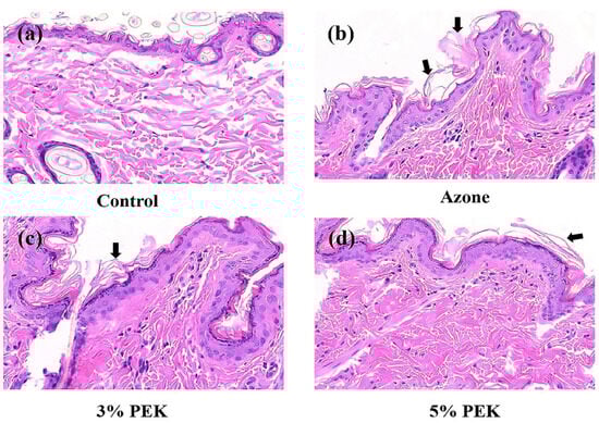 Skin irritation refers to reversible changes that occur locally on the skin after the application of a test substance. The skin irritation response is mainly characterized by the activation of T-cells and can induce symptoms on the skin surface such as erythema and edema []. The degree to which the penetration enhancers irritated the skin was analyzed using a self-contrasted method. The rats were anesthetized by intraperitoneally injecting 20% urethane. The hair on the surface of the abdominal skin was removed, and the undamaged skin selected was divided into three areas of 1 cm × 1 cm each; one was set as the blank control, one was treated with azone as the positive control, and one was treated with PEK. The skin surface was cleaned with normal saline before the experiment. The administration area was coated with 10 μL of the test samples after the skin was completely dried and covered with double-layer gauze, and the gauze was fixed with medical anti-allergic tape. The erythema index (EI) of the abdominal skin surface of rats was detected using the Mexamter MX18 pigment testing probe in the Cutometer® Dual MPA580 system (Courage+Khazaka Electronic GmbH, Cologne, Germany) at 0 min, 15 min, 30 min, 1 h, 2 h, 4 h, 6 h, 8 h, 24 h, and 36 h after administration. The testing probe measured the red pigment on the skin surface based on optical principles, and the EI value could be directly read from the software of the system. The higher the value, the greater the degree of erythema on the skin surface. Another group of rats was treated using the above-mentioned methods. The experimental rats were anesthetized and euthanized when the EI value was at its maximum. The skin was removed and soaked in 4% paraformaldehyde for its fixation, embedded in paraffin, sectioned, and then stained using H&E. The stained sections were then observed under an optical microscope.