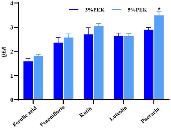 Enhancement effects of PEK on different model drugs (mean ± SD, n = 4; * p < 0.05 compared to the 3% PEK group; QER: quantitative enhancement ratio; PEK: perilla ketone).